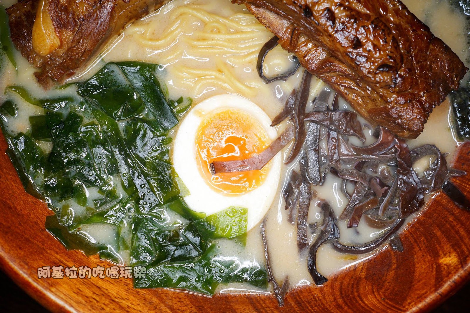配菜有「脆脆的海帶芽和黑木茸,以及彈嫩的糖心蛋」,多種的食材口感,讓整碗拉麵吃起來更有豐富度。