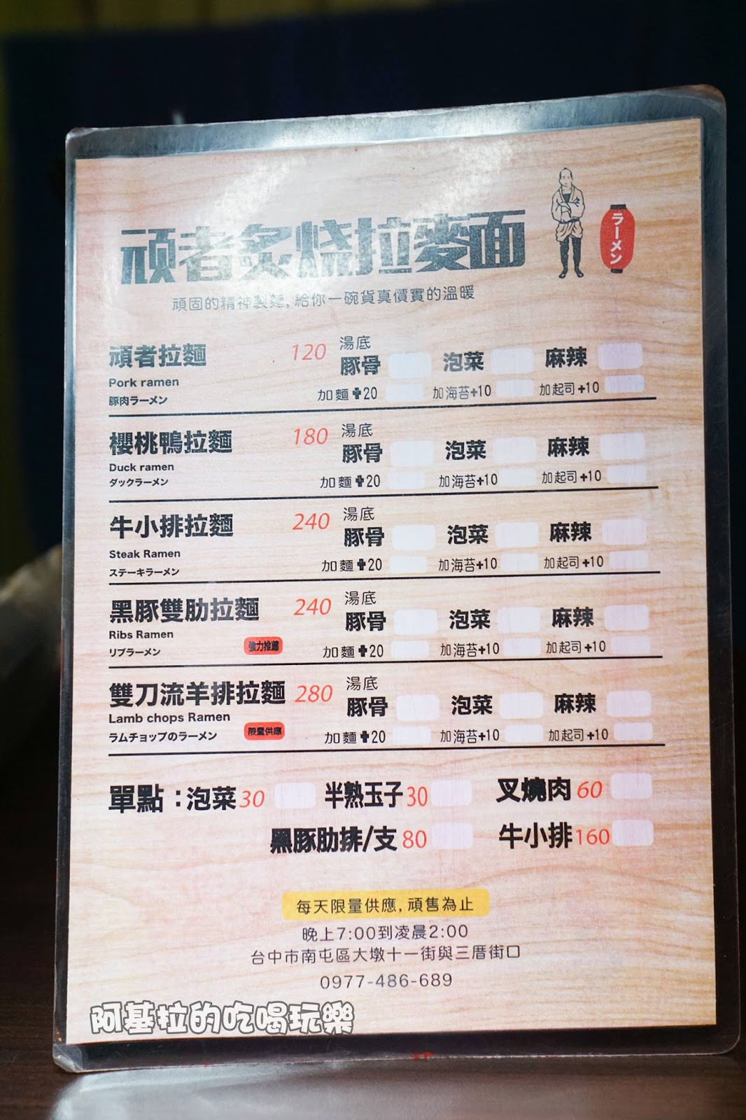 年輕的老闆自從18歲接觸到賣拉麵的工作之後,就對拉麵產生濃厚的興趣,便開始展開學習之路,經過一段時間,很難得地獲得了日本師傅的轉承,現在自己開店,除了延續日本拉麵精神之外,在真材實料的豚骨湯底之中加入了獨家滷汁和炙燒肉品,精心調製出可以展現頑固精神的拉麵,開幕至今已征服不少台中人挑剔的嘴。