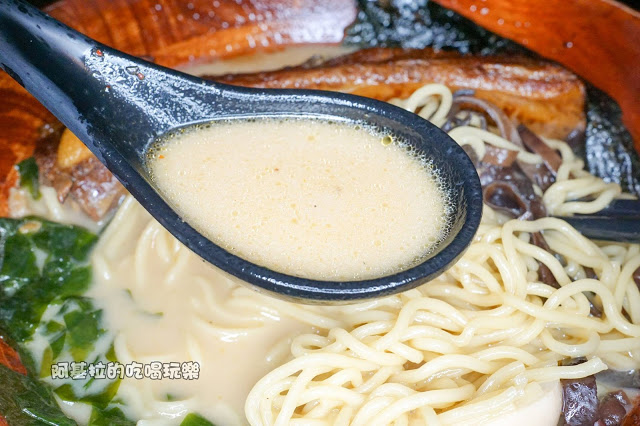 白色的豚骨湯頭是使用獨家滷汁和大骨湯調製而成,喝起來鹹香甘醇好順口,帶有自然的奶味和蒜味,整個就是濃郁香醇、層次豐富,而且不重鹹、不油膩,熱呼呼的好好喝,令人整碗湯都想喝光光。