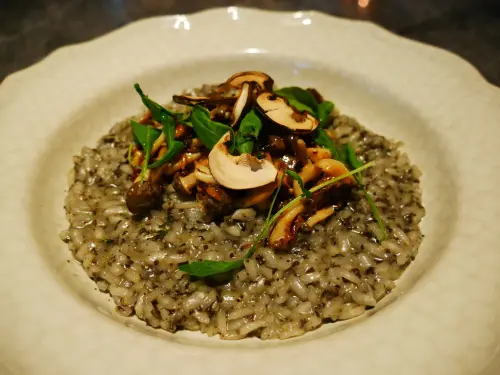 燉飯是用自製青醬加入長夾豆調合,和帶有哇沙米味道的無菁再加入義大利米去燉煮,口感帶有米芯,和醬汁調合的不僅入味又好吃!