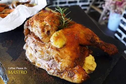 「爐烤雞肉奶油青醬燉飯」上桌所看到的是燉飯與配料分開擺放的方式,上面的雞肉是先用烤爐烤後在手撕處理,吃起來口感不乾柴又多了分爐烤的香氣。
