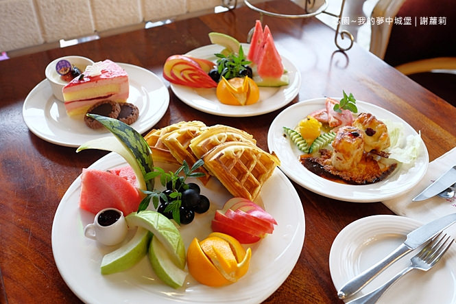 我們抵達的時間還不算晚,趁著下午休憩時刻,就坐在大廳品嚐起這專屬假日的悠閒時光,雙人下午茶套餐以英式午茶的方式呈現,有鹹食、蛋糕,還有不少時令的季節水果。
