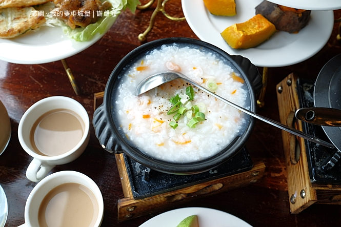 純中式餐點的表現,裡面不乏許多養生健康的料理,像是結合了吻仔魚的粥品、養生蔬菜湯,還有蒸煮地瓜、南瓜,也吃得到新鮮的生菜及季節水果,滿滿一桌,多到我們都快吃不完了啦!XD