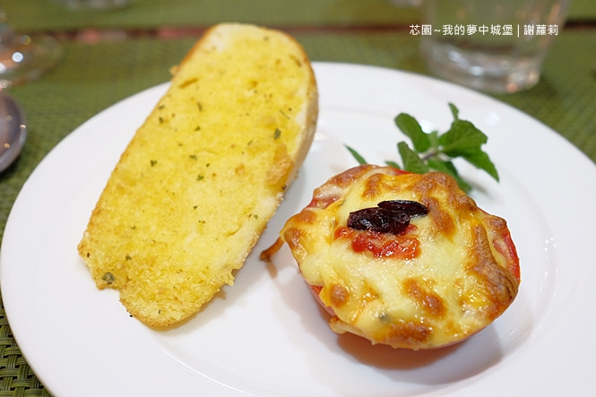 塗上大蒜抹醬的吐麵麵包、一旁還有奶味十分濃郁的焗烤番茄,味道都還挺不錯的。