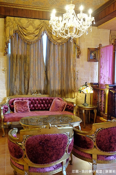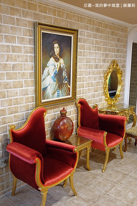 服務小姐是個很可愛的阿姨,介紹的時候還邊說她自己也好喜歡這個房型,像這個掛上仕女壁畫的雙人座椅,跟本就像是城堡走裡面場景嘛!