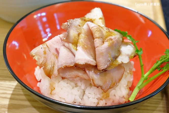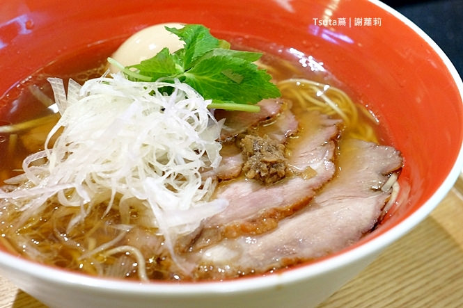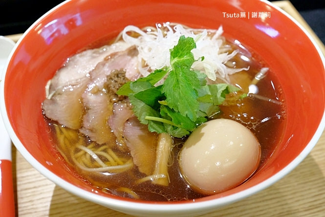 不管是擺盤、碗的尺吋、甚至是顏色,都跟日本本店完全一模一樣,主要內容物有四片叉燒肉、玉子蛋、份量不算少的日本大蔥、筍干及些許羅勒葉。