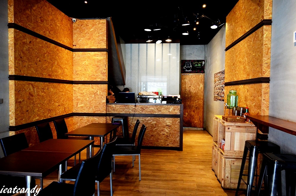 打開門後映入眼簾的是一整片的木質裝潢,搭配黑色桌椅,