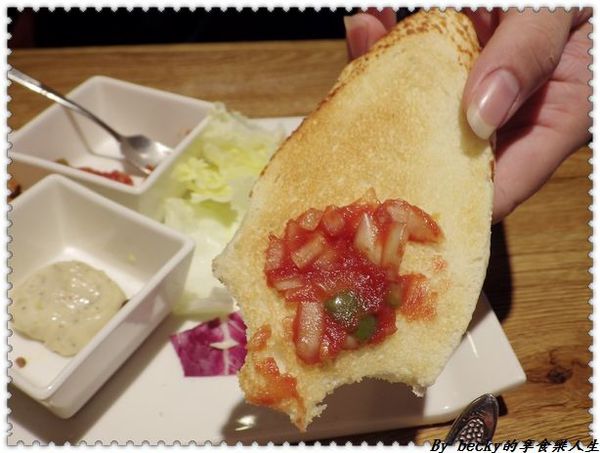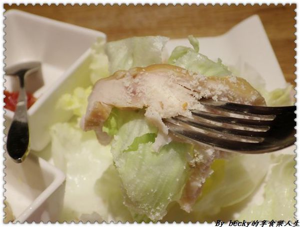 這個佐醬是凱薩醬與莎莎醬,燻雞肉旳份量非常多,入口咀嚼非常鮮嫰,而生菜新鮮,帶有水份,因上面有灑起司粉,吃起來鹹鹹又美味,整個就很好吃。