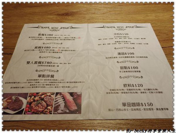 這是菜單~有380元套餐、480元套餐,當然也有雙人套餐780元,可選擇380元,搭配480元的組合,非常划算,套餐都有主餐的附餐,沙拉、湯品、甜點和飲料,除了套餐,當然也有單點,皆需加收一成服務費。
