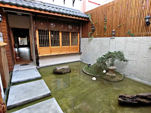 走入沐芳庭印入眼簾的是一片日式庭園,可能今天剛好飄著細雨所以池子是空的,