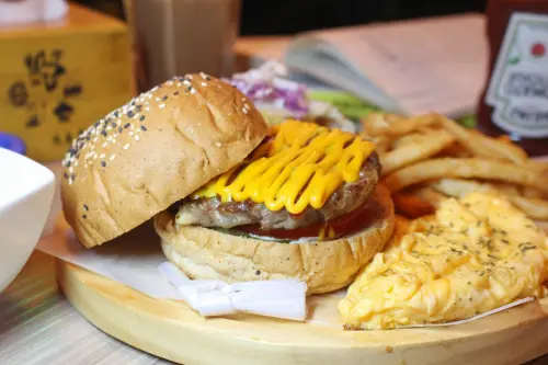▼這盤早午餐中包含了牛肉堡、薯條、沙拉、炒蛋,還有一杯飲料