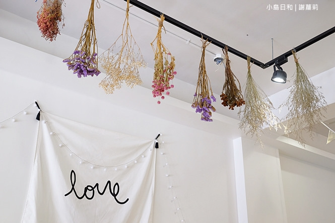 天花板用不少浪漫的乾燥花垂掛綴點著,看起來簡單乾淨,是一個讓人覺得好舒服的畫面。