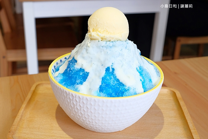像富山士般湛藍,是用藍柑橘淋醬做出來的呈色,上頭淋上優格醬、蜜糖及香草冰淇淋,吃來不甜不膩,其中交織著優格特有的淡淡酸氣,香草冰淇比我想像中好吃,奶味好濃好濃,味道暫且不說,光是療癒的外表就足以融化人心囉!