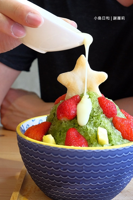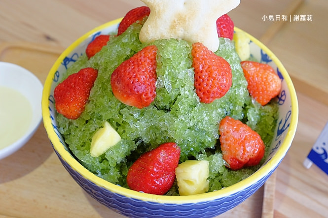 長相真的宛如一顆聖誕樹,是說看它豔綠綠的顏色,大家應該都猜到這是抹茶口味的挫冰了吧!上頭用新鮮草莓、鳳梨綴點,還有一塊星星造型的仙貝餅乾呦!