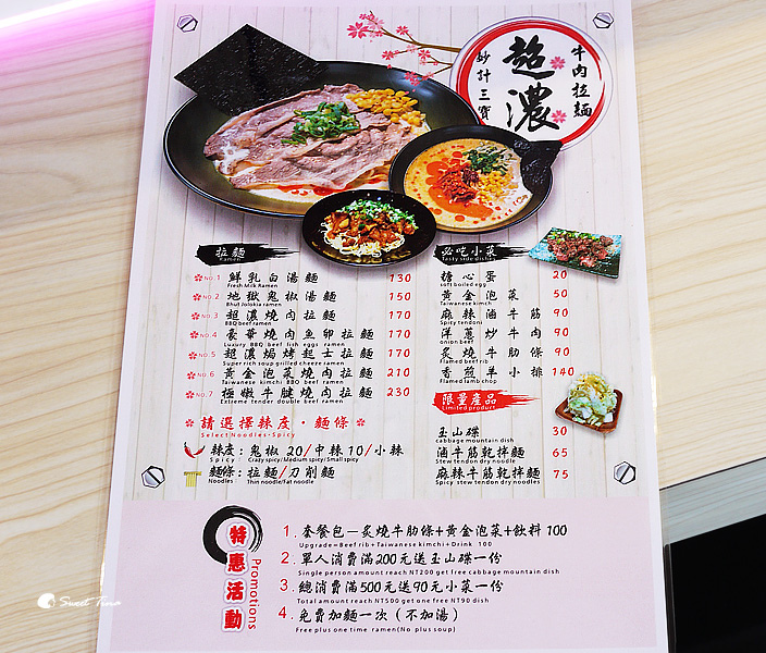 來看看妙計三寶超濃拉麵提供了哪些餐點吧,拉麵的部份有7種,小菜的部份有6種,另外也有提供乾拌麵,麵條的部份可以選擇拉麵或刀削麵,但這天Tina忘了提醒店員一碗要用刀削麵,沒吃到覺得有點可惜,只好改天再來品嚐囉,另外店家也提供了一些特惠活動,而還有免費加麵一次咧,完全不怕吃不飽啊! 所以來這用餐的朋友可以搭配著特惠活動會較超值哦!