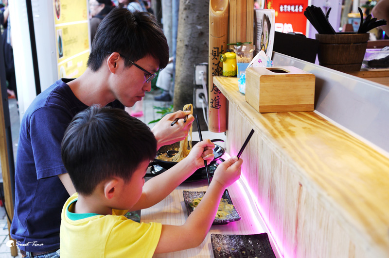 搭建的店面雖然小巧,但吧檯的座位還別有一番風味,帶瑋兒出門的我們通常不會選擇這樣的位置,但店家讓座位外保留了些間隔,所以即使是坐在吧檯也不會因人潮擠而感到不適,因此這天我們就決定坐吧檯享用拉麵啦~