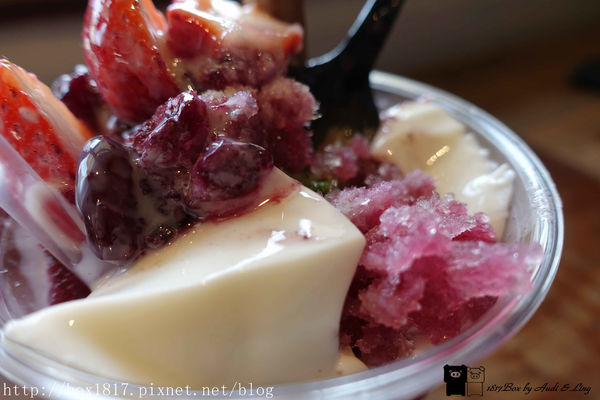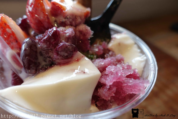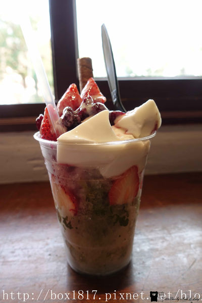 有草莓+莓果+杏仁豆腐,底層是抹茶碎冰,上層淋上莓果醬,加上巧克力捲心酥,完美!!