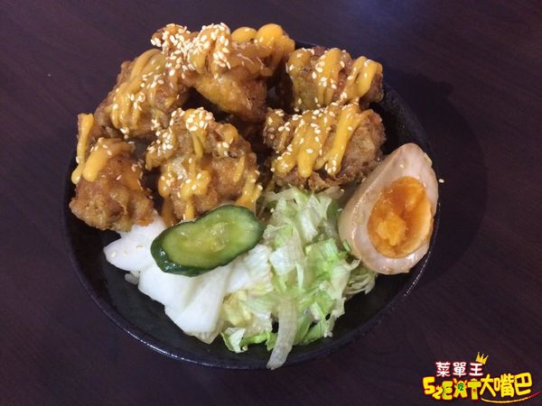 ▼黃金唐揚雞,看起來是不是很誘人?上頭的醬料有點像是義大利麵裡常吃到的橘醬,又有點像千島沙拉醬且就先叫「千島橘醬」吧!淋著「千島橘醬」的唐揚雞酥脆可口,裏頭肉質鮮嫩多汁,配上爽口生菜一拍即合,糖心蛋更是迷人,和飯拌在一起大口吃,飽足感爆表了!