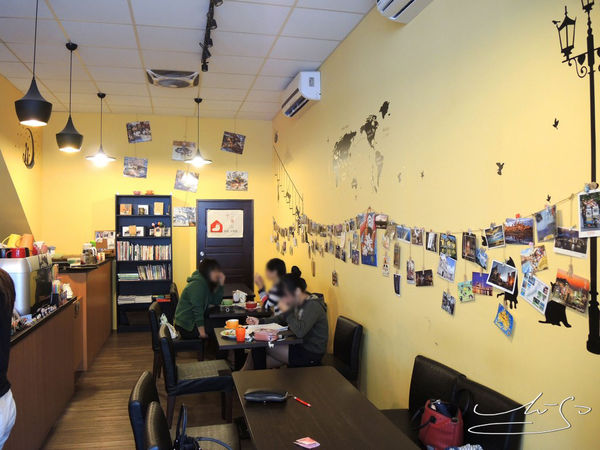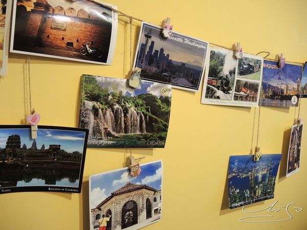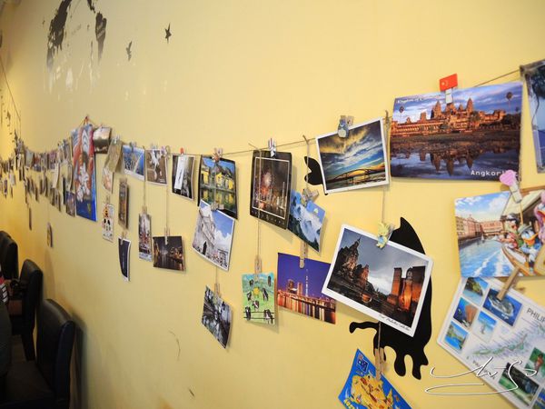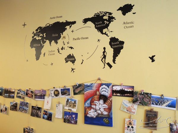 牆上有著來自世界各地的明信片以及世界地圖