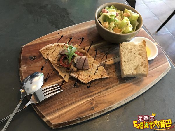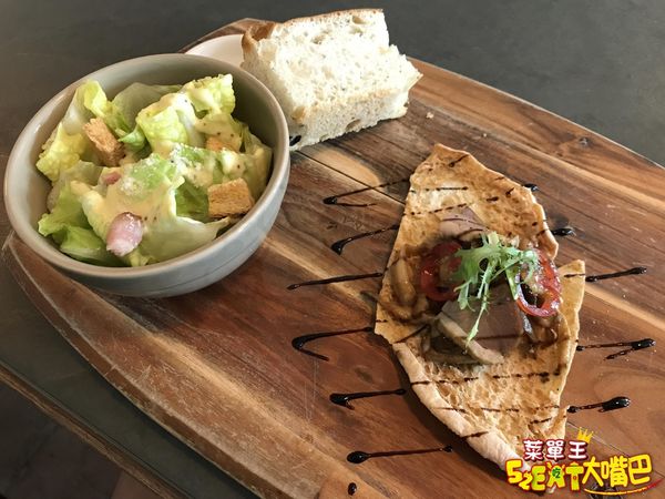 ▼餐前沙拉、麵包與脆餅,沙拉以美生菜為基底,加上類似千島醬的沙拉醬,口感清脆爽口,最厲害的就是這個前菜了!!吃起來有點像印度脆餅,酸酸甜甜的番茄增加了整體的風味,加上義大利油醋與櫻桃鴨胸,味道協調不突兀!