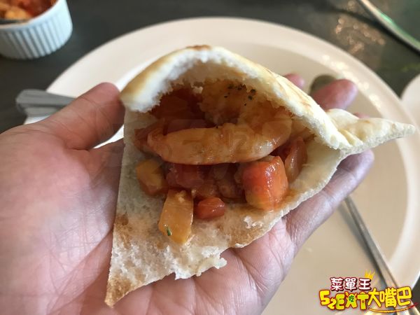 ▼將披薩球切開包進辣蝦醬大口咬下,酸酸甜甜的番茄,微辣的鮮蝦Q彈可口,更厲害的是餅皮的麵香令小編印象深刻,口齒留香!