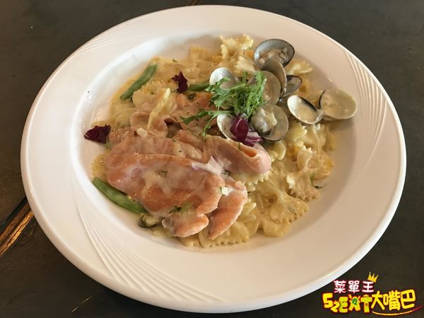 ▼奶油煙燻鮭魚果香蝴蝶麵,4大片的煙燻鮭魚讓人驚呼連連,成堆蝴蝶麵看起來讓人食指大動!