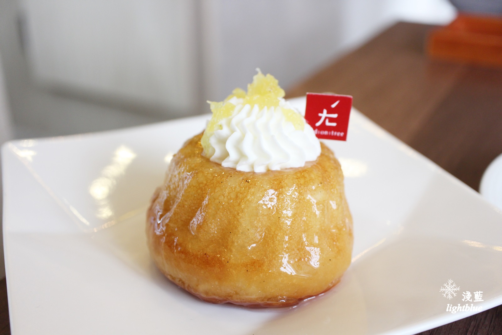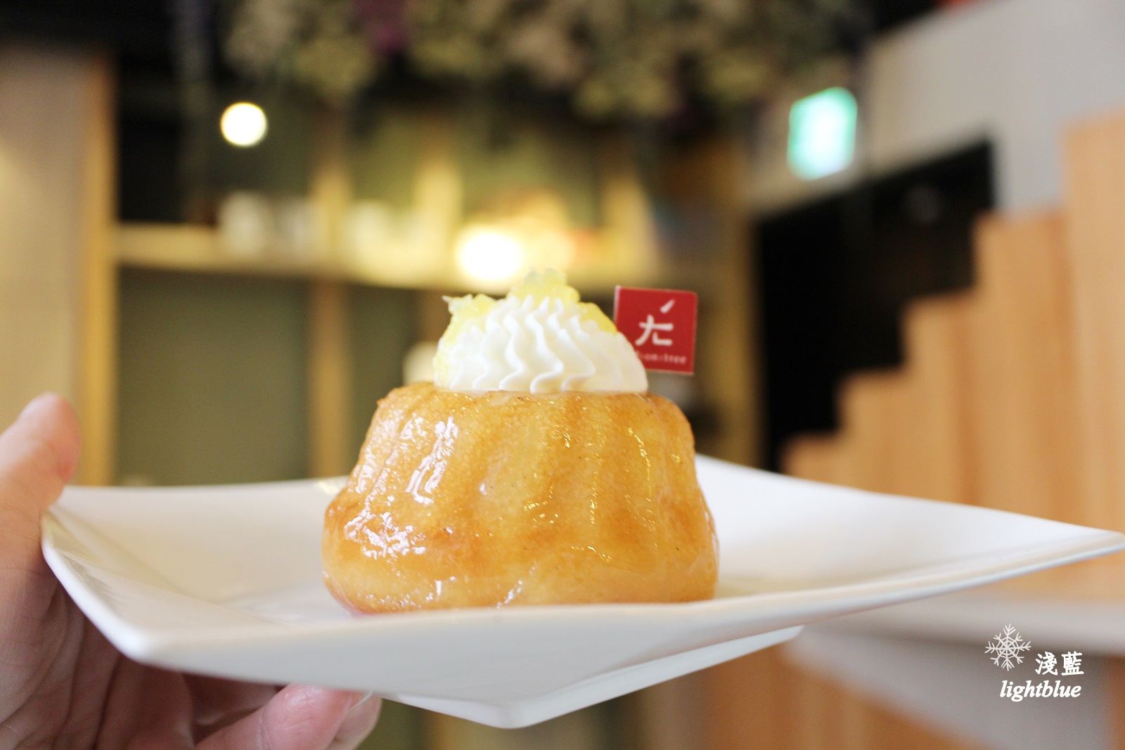 他們家的甜點看起來都小小一個,而且有大半都是吐司、司康等會很飽的東西,東挑西選半天,我終於選了這個鳳梨蘭姆芭芭