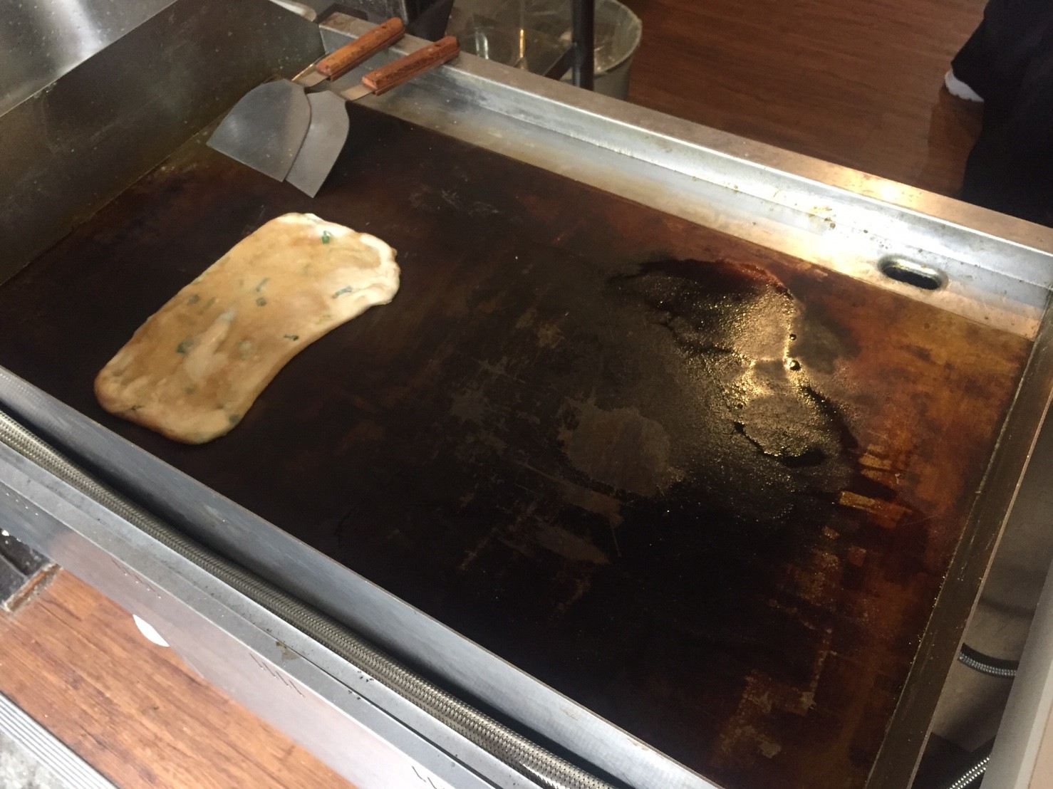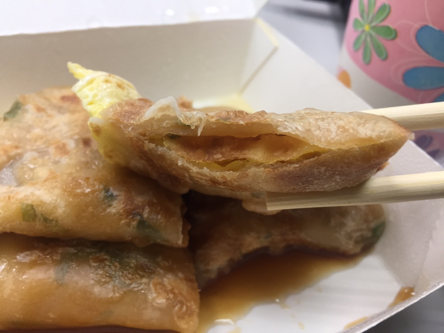 先來看看他的蛋餅,使用麵團的蛋餅皮,份量還OK,最喜歡這種吃一個就飽足感很夠,從小就很喜歡看蔥油餅這種皮由白轉呈透明的變化,一直覺得很酷,厚實感中等,醬油膏味道偏淡,整體吃起來算爽口