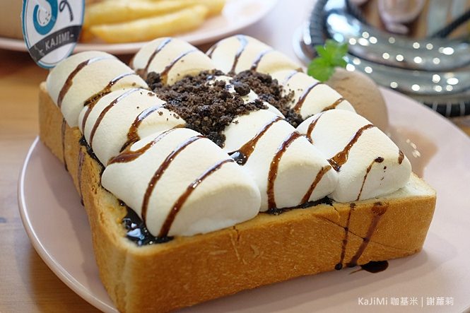 這個蜜糖棉棉就是棉花糖吐司,很多輕食、甜點店都能瞧見它,但咖基米家的真的好好吃!旁邊還附一抹巧克力口味的冰淇淋可以沾著一塊吃。