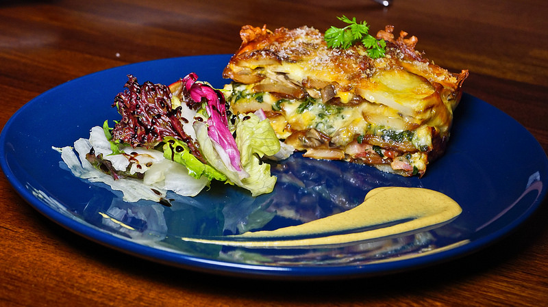 這道菜是將波菜切細碎後乾炒,再一層一層鋪上磨菇,炒過的培根丁加上馬茲瑞拉起司以及美味的美國馬鈴薯切片