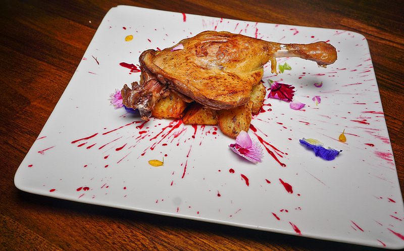 上面盛滿了美國迷你馬鈴薯與鵪鶉蛋, 在料理過程搭配帶有丁香,百里香,迷迭香的鴨油下去煎、烤, 呈現酥、嫩兩種口感的處理, 香味口感不止分明美味,入口後香氣慢慢在嘴裡話化開再層層疊上, 每一口都吃得到驚喜, 裝盤造型設計也特別有意思,特意裝成鳥巢的概念,視覺效果一百分