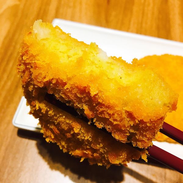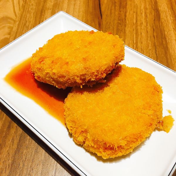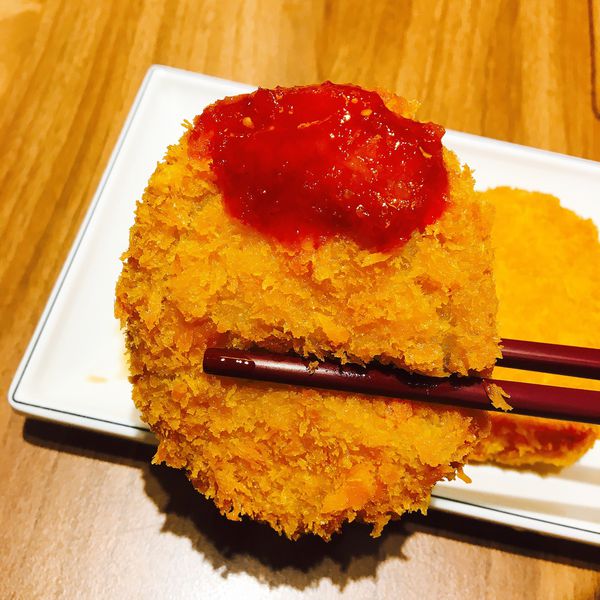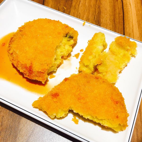 剛出鍋還有些燙口,藉著熱乎勁兒的可樂餅果然是最佳的~