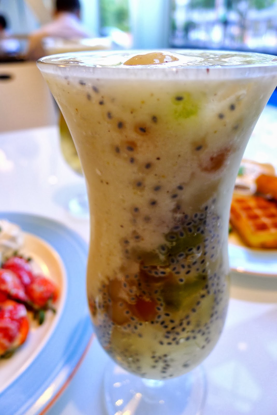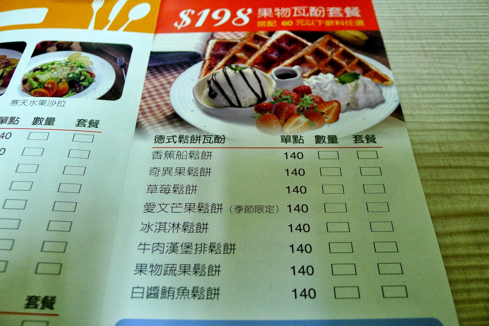 果物憩席特別是它的飲料跟鬆餅,前輩建議我點白醬鮪魚鬆餅(鹹)+招牌飲品奇異檸檬切打飲套餐,以及草莓鬆餅。