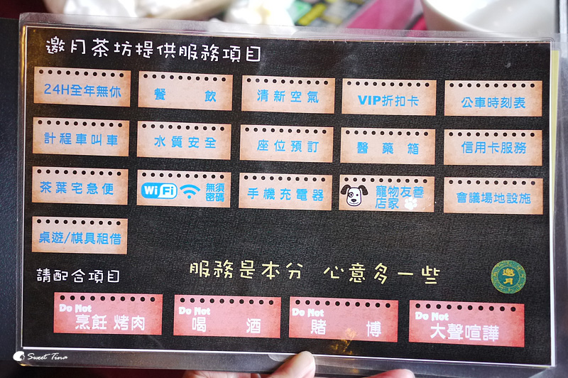 邀月茶坊提供的服務,也有WIFI和手機充電器,好適合沒事來這兒放空,不過都來到山上還划什麼手機,哈哈,當然是泡茶聊天囉! 這兒還是寵物友善店家,可以帶毛小孩來這兒走走呢!