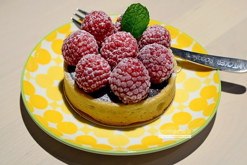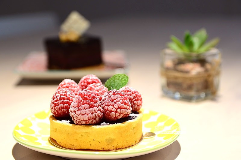 厚度適中的塔皮,中間內層由鮮紅欲滴的覆盆子、苦甜巧克力、覆盆子醬組合而成,酸甜滋味不膩口。