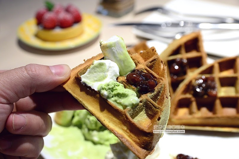 外層烤到酥脆像是煎餅的原味鬆餅上頭灑上些許抹茶粉,再放上鬆綿的蜜紅豆,一旁附上抹茶紅豆冰淇淋和打發鮮奶油,還有微燒烤的棉花糖。甜度稍微高一點,適合來杯無糖的飲料一起享用。