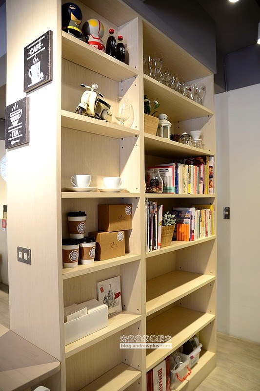 ▼點完餐之後就可以回到座位上好好的等食物降臨囉!剛剛那一大面的黑板菜單,正面是一個大櫃子~裡面除了杯子小玩具,還有一些旅遊的書籍!看到有興趣的書就取了一本到桌子上慢慢閱讀