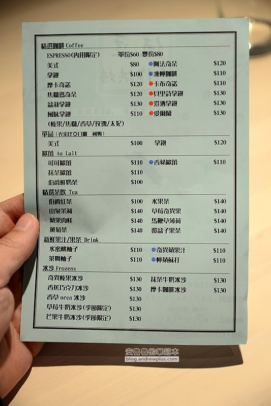 ▼飲料表示藍點為冷飲限定,紅點為熱飲限定,除了咖啡,還有茶飲、冰沙等