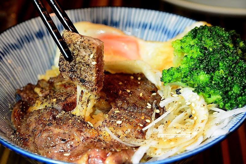 一整塊的五分熟沙朗牛排肉質佔據了整個碗麵,上頭一樣是有一顆炸蛋、洋蔥絲以及青花椰菜,最下面是軟Q的米飯