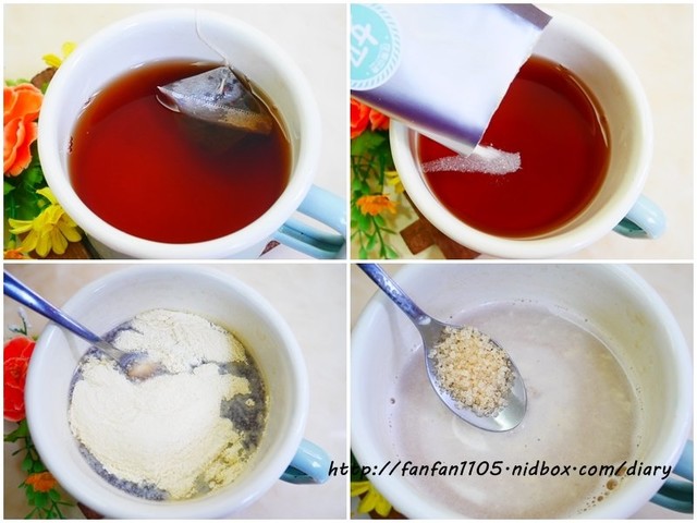使85度c的熱水,沖泡紅茶包約3-5分鐘後,加入豆奶粉,攪拌均勻後再加入砂糖,可依各人喜好來增減