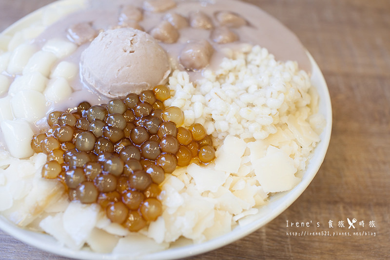 轉角芋見泥有粉圓、白玉湯圓、芋圓、芋泥、芋泥球、小薏仁等多種豐富的配料鋪在蔗片冰上,