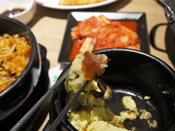 拌飯的部分用韓醬微辣的口感,融合蔬菜一同攪拌,底部鍋巴香脆口感,整體味道非常夠味,
