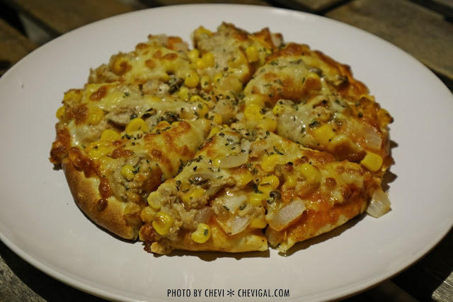 餅皮有咬勁,上頭的配料有玉米、鮪魚、洋蔥丁和起司,香氣很足夠,吃起來是會有飽嘴感的唷!