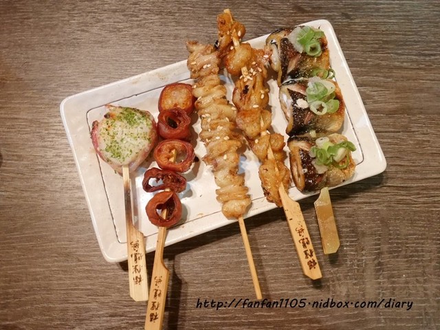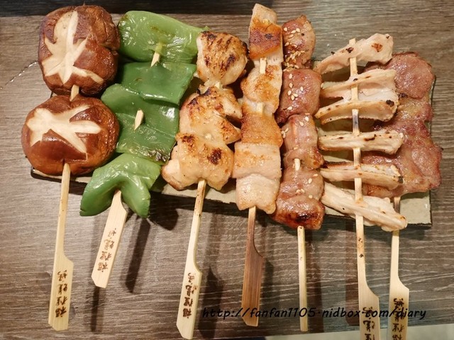 由左至右分別為香菇、青椒、鹽烤雞腿串、鹽烤松板豬、醬燒雞心串、鹽烤雞軟骨、無骨牛小排