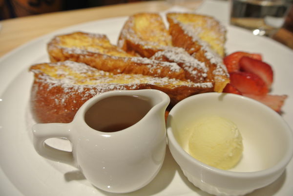 土司外層沾滿蛋液,有濃濃的蛋香,厚厚的土司咬下是鬆軟的口感;另外會附上奶油和楓糖漿。