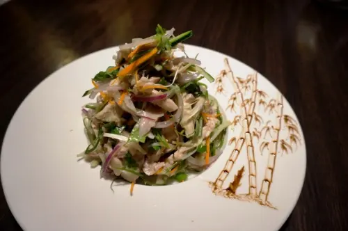 首碟是北京燻肉、翡翠豆腐、椒麻雞,份量都是一口大小,翡翠豆腐的小碗和小湯匙讓我不得不假裝優雅般,小口小口品嚐….不知道是不是古代人也是這樣用法,才顯得優雅淑女XD