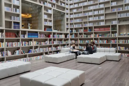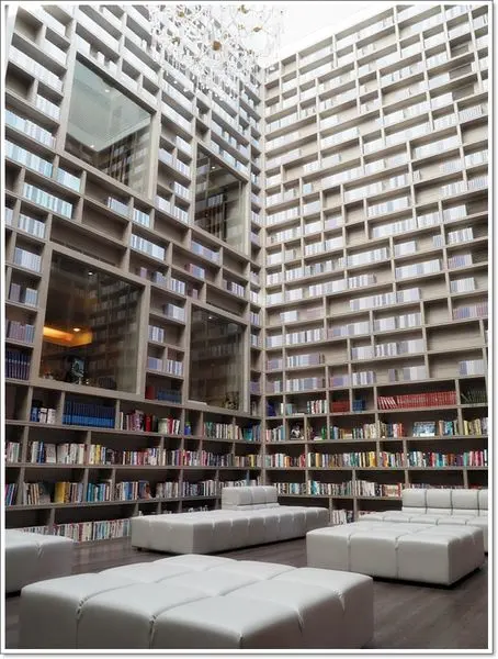 前方的亮處就是剛剛進來的入口,黃色的通道與黑白色系的藏書閣的空間感很棒。