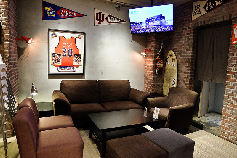 牆上的運動旗幟和這件被裱起來的Stephen Curry球衣 (勇士隊當家球星, 可算是當今最會丟三分球的高手了) 都是真貨喔