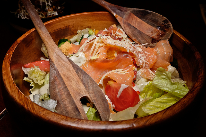 木盆沙拉是CAMPUS 的招牌餐點之一, 超大的木盆, JUMBO Size 的蘿蔓生菜, 搭配超~~肥美的燻鮭魚, 然後再放進去帕馬森起司,南瓜,黃瓜,綠花耶菜,杏仁果,玉米片,培根脆片