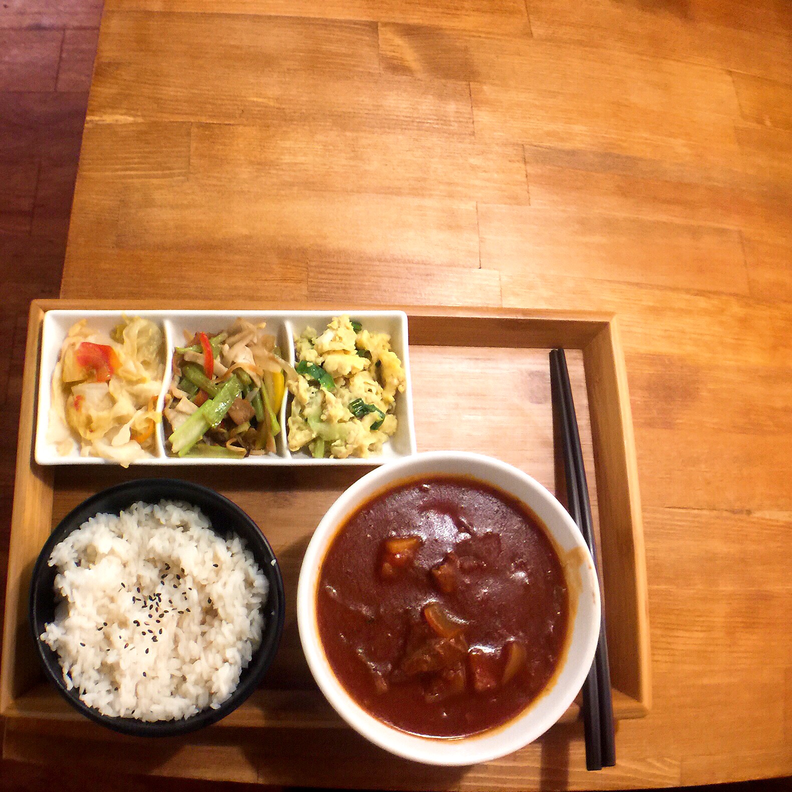 餐點搭配著木質的托盤